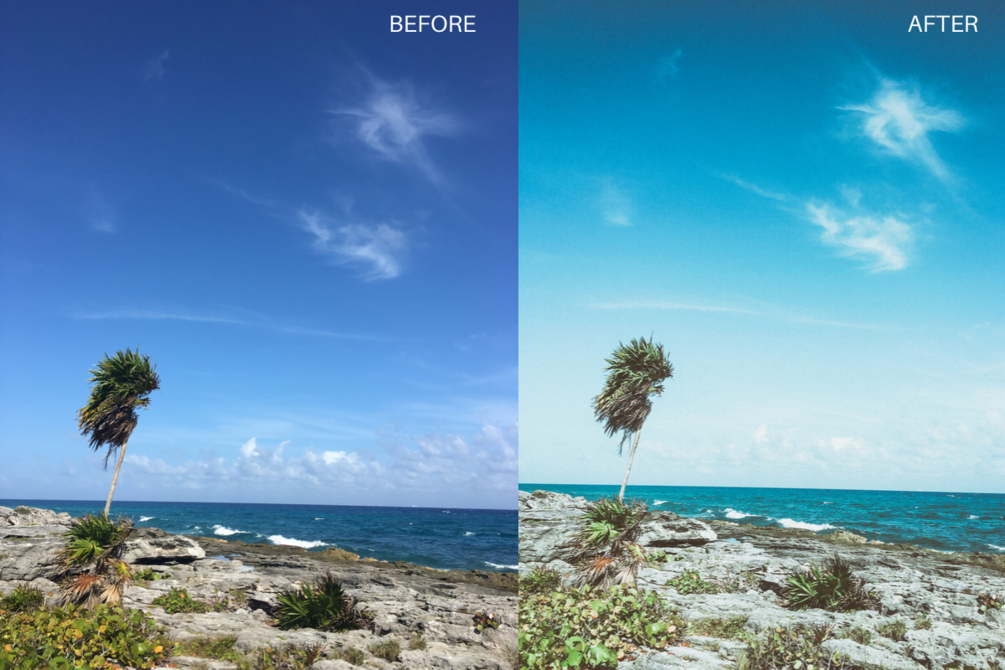 SAND DUNES (before/after pictured) - cool-toned and bright, great for making every beach look tropical and white sand.